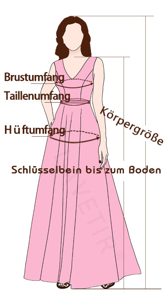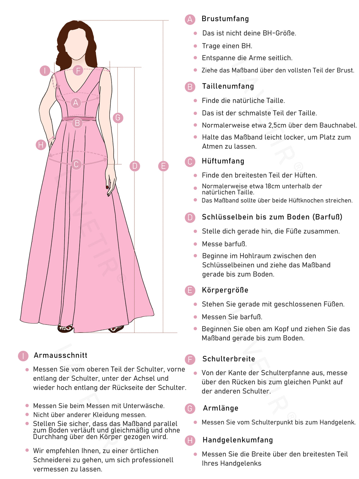 Wenn Sie eine individuelle Größe wählen, messen Sie bitte Büste, Taille, Hüfte, Schlüsselbein bis zum Boden (bei langen Kleidern) und Schlüsselbein bis Saum (bei kurzen Kleidern) in CM. So messen Sie: https://www.lavetir.at/pages/messanleitung